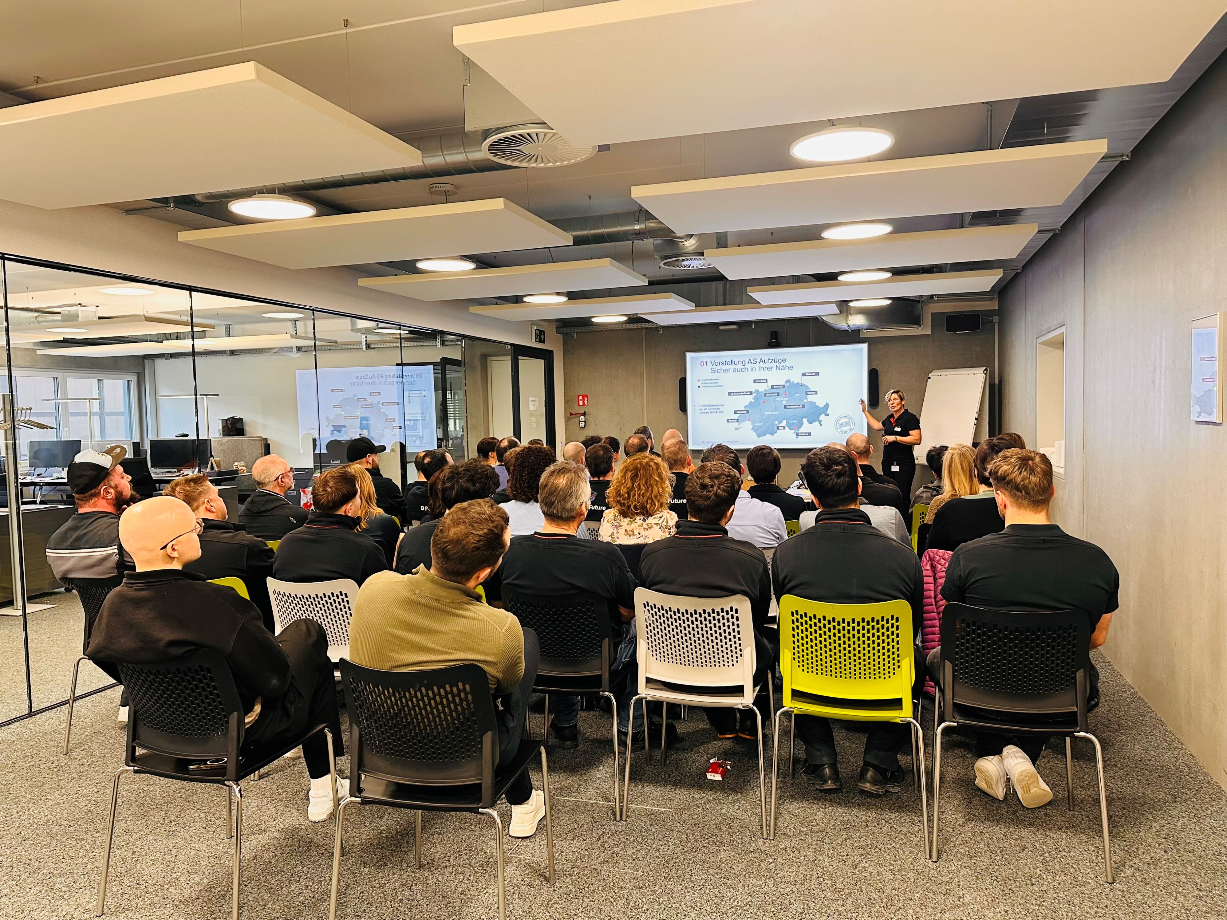 Geschäftsführerin Tanja Lepple begrüsste die Gäste und stellte das Unternehmen sowie den neuen Standort vor, der seit Dezember in Steinach angesiedelt ist. Anschliessend erklärte Natalie Häcki von der Mutterfirma Schindler Group das Berufsbildungssystem. In der Ostschweiz bildet das Unternehmen nebst Kaufmann/-frau auch Anlagen- und Apparatebauer/innen, Polymechaniker/innen sowie Produktionsmechaniker/innen aus. Diese werden bereits im dritten und vierten Lehrjahr gezielt auf die Liftmontage spezialisiert. In der Ausbildung arbeitet AS Aufzüge AG mit Partnerfirmen zusammen, darunter die Bühler Group in Uzwil.